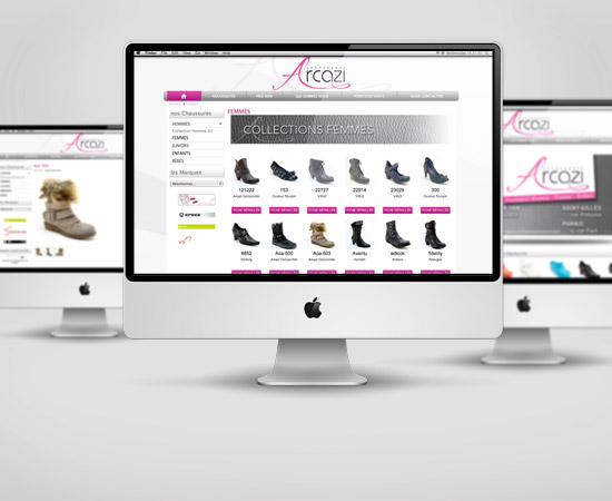 Notre agence web en Vendée a réalisé le site internet catalogue de ARCAZI Chausseur, enseigne de magasins de chaussures en Vendée (85) et Loire Atlantique (44). Prise en charge du projet de la création de l’interface graphique (d’après leur identité visuelle existante) et du découpage PHP/HTML/CSS de celle-ci, jusqu’à la mise en place une interface d’administration sécurisée, pour la gestion des mises à jour de toutes les pages du site (gestion des contenus de chaque fiche produit), en conservant la possibilité de gérer et modifier les balises méta pour l’optimisation du référencement naturel SEO de chaque page du site internet dans les principaux moteurs de recherche.